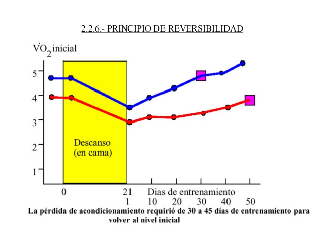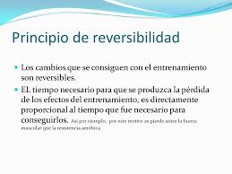 El principio de reversibilidad nos advierte que los beneficios obtenidos a través de un programa de entrenamiento se verán reducidas o se perderán completamente si el entrenamiento se reduce o suspende completamente.[2] Este fenómeno se llama desentrenamiento y aparece rápidamente una vez que se ha suspendido el entrenamiento. En algunos casos es posible ver pérdidas de condición física en tan solo dos semanas de interrupción, incluso en adaptaciones que requirieron mucho más tiempo para lograrse.[5]